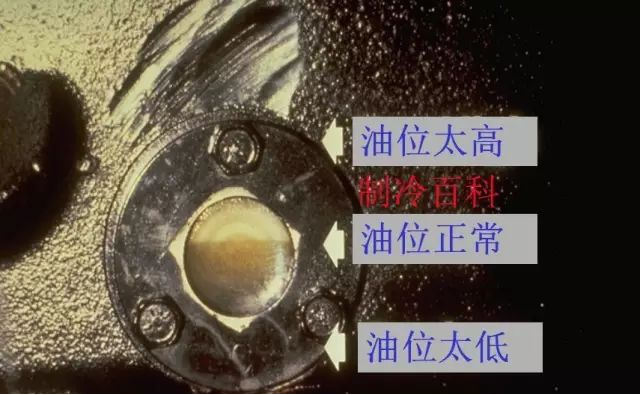 它是指润滑油在油储存容器中的液面高度。冷水机的储油容器都设置有油位显示装置,一般规定储油容器内的油位高度应该位于视镜中 央水平线上下5mm。规定油位高度的目的是为了保证油泵在工作时,形成油循环所需要的油量足够。油位过低容易造成油泵不足,从而引起运行故障或者损坏设备。